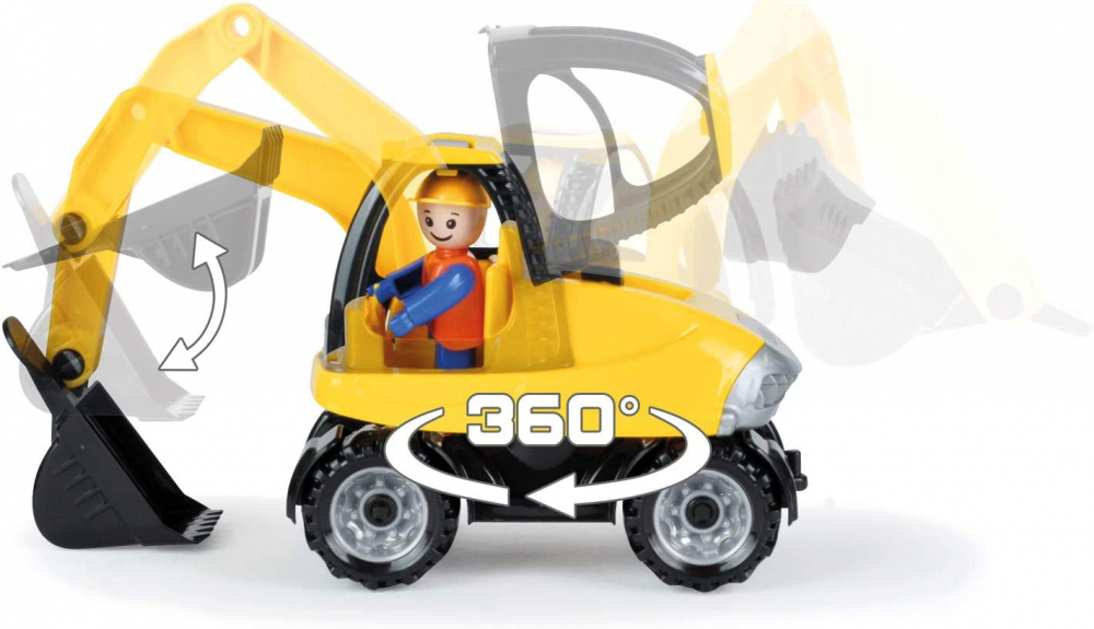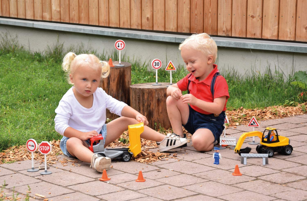 Setul de constructie include: basculant, excavator, 17x semne de circulatie, bariera de trafic, 3x papusa.