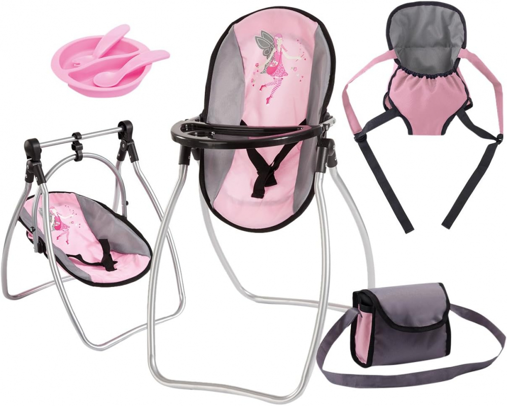 Scaun de masa 4in1 transformabil Bayer Vario Rosa pentru papusi pana la 46 cm,include marsupiu reglabil, gentuta de umar, accesorii hranire asortate