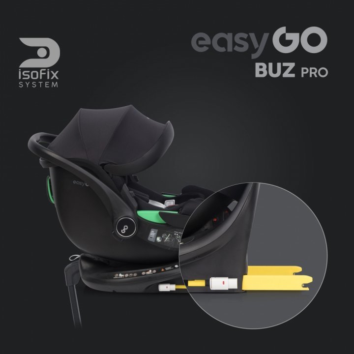 * Scaunul BUZ PRO vine insotit de o baza isofix rotativa care se fixeaza in masina, astfel incat instalarea si scoaterea scoicii din masina devine o treaba foarte simpla. Mai mult de atat, datorita functiei de rotatie, asezarea si scoaterea copilului din scoica se face foarte usor prin pozitionarea acesteia in lateral. Totodata, devine imposibila instalarea incorecta a scoicii in masina, baza isofix cupleaza scoica corect printr-un simplu click. Puteti da uitarii instalarea intortocheata cu ajutorul centurilor masinii.