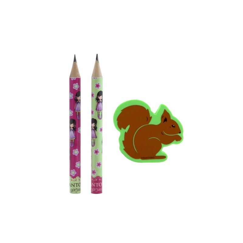 Setul Gorjuss Fiesta You Brought Me Love mai contine si doua mini creioane viu colorate si inscriptionate cu adorabila fetita Gorjuss si o radiera sub forma unei veverite foarte dragute.
