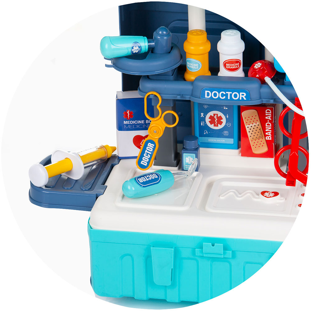 - Set multifunctional cu diferite parti - o valiza, o masa cu instrumente medicale, ochelari, casti, seringi si diverse dispozitive, astfel incat copilul mic sa isi poata "examina" pacientii