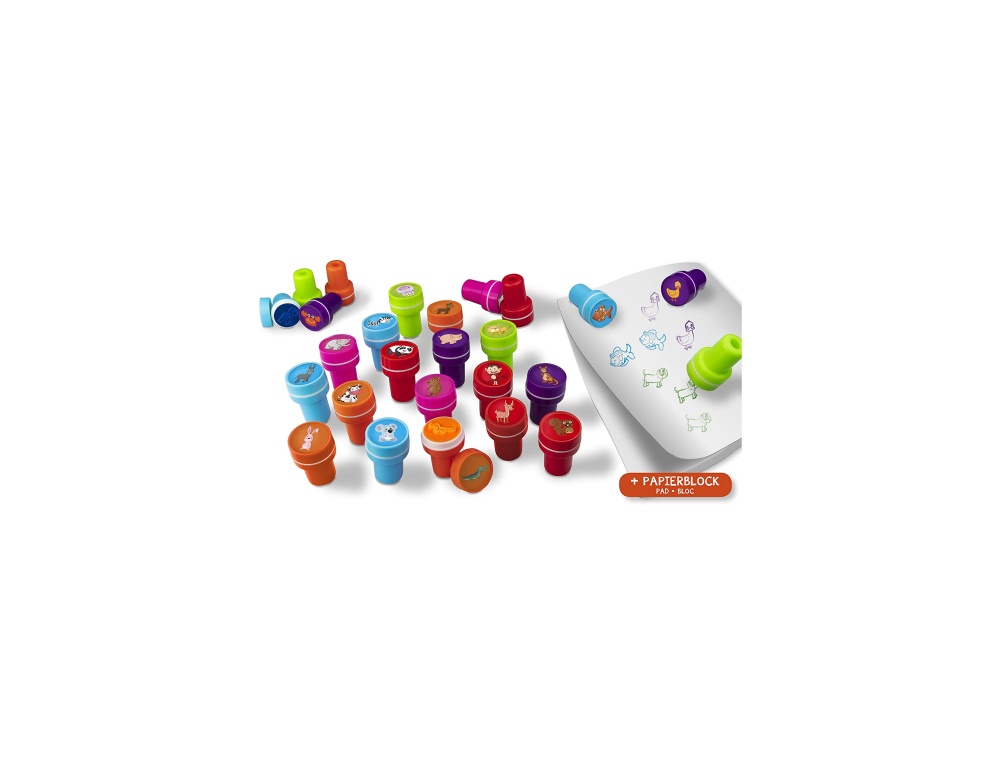 Setul contine 26 de stampile cu modele de animale in 6 culori diferite si un bloc de hartie pentru stampilare.