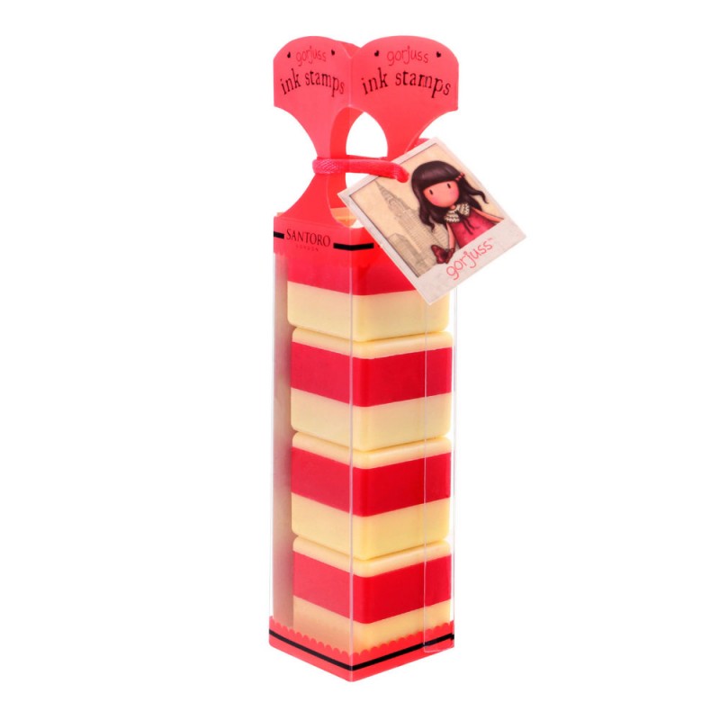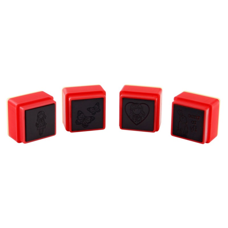 Setul de la Santoro cuprinde 4 modele de stampile cubice. Cerneala este protejata pentru ca fiecare stampila este prevazuta cu capac. Acestea vin aranjate intr-o cutie transparenta, accesorizata cu o fundita in partea de sus.