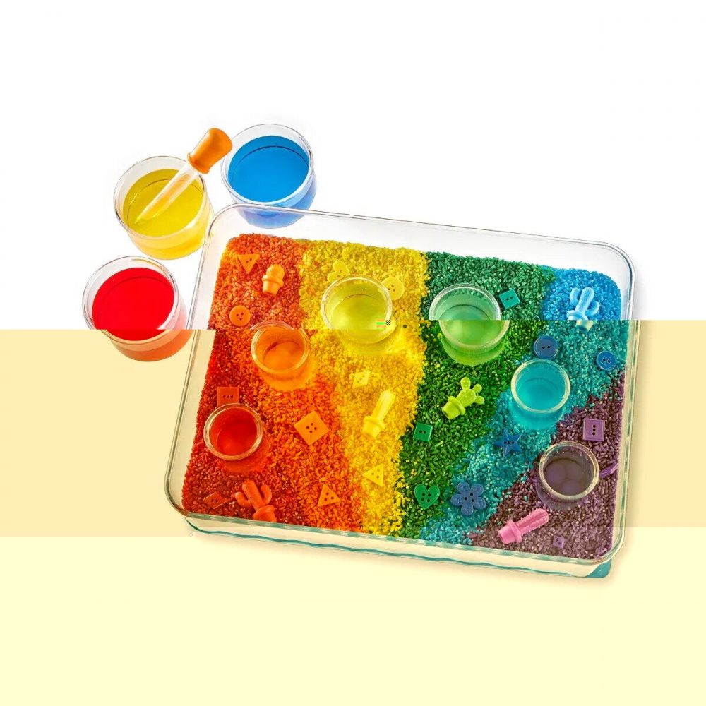 - folositi paharele de sortare si instrumentele de motricitate incluse in set cu o varietate de materiale, cum ar fi: apa, nisip, bilele de apa, leguminoase uscate si multe altele