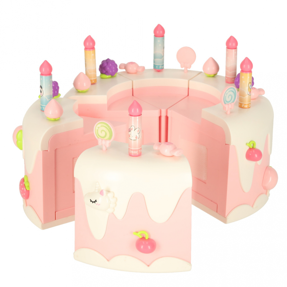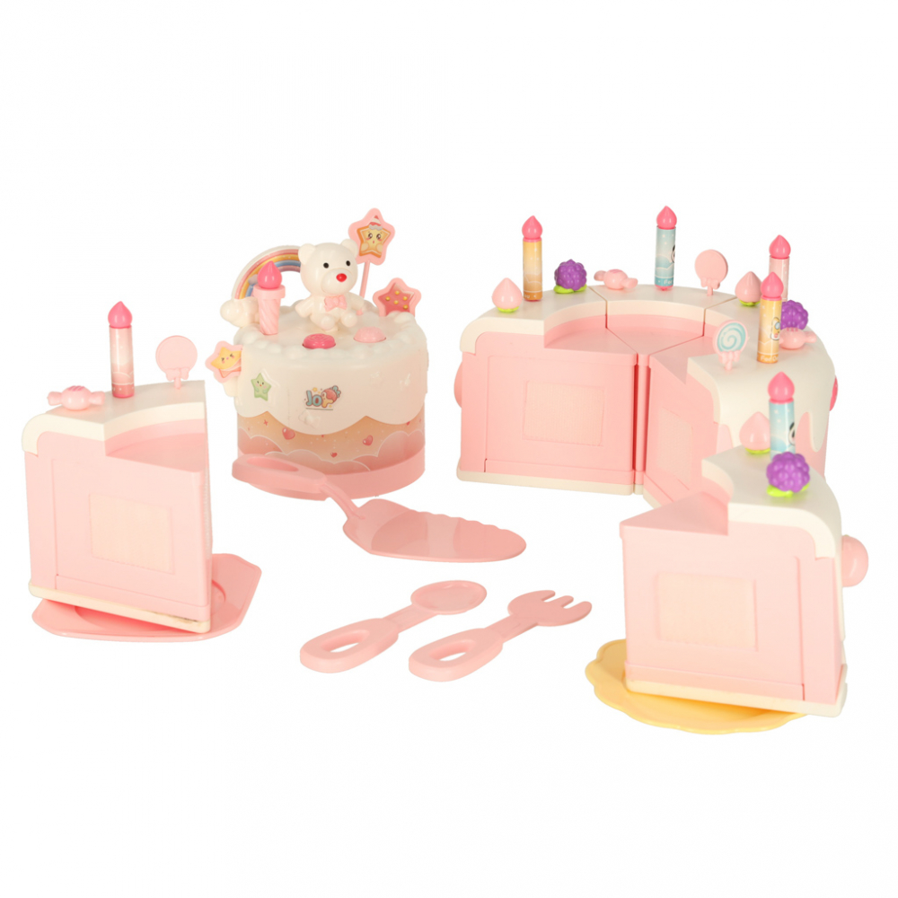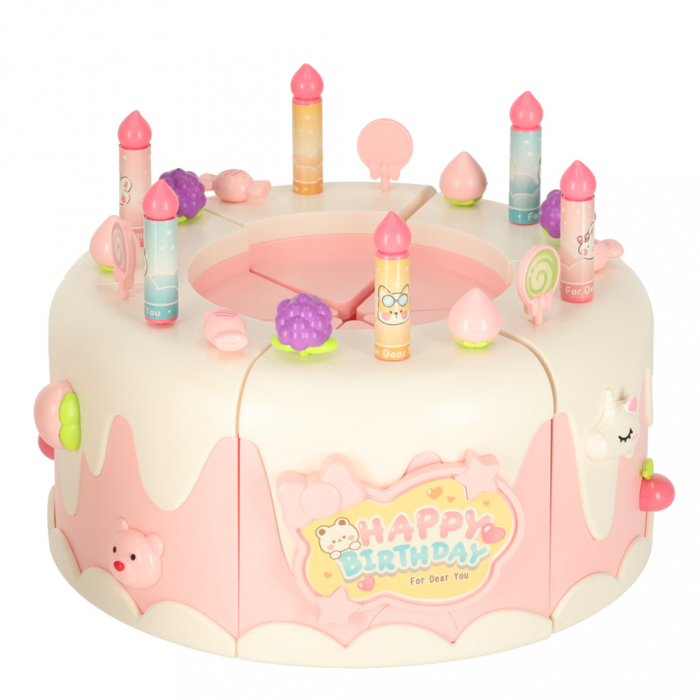 Set Tort aniversar interactiv pentru copii, cu sunete, elemente mobile, pe doua nivele, compus din 16 felii conectate velcro, Pink