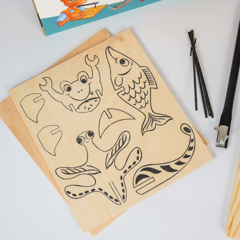 • Setul conține atât modele cu animale, pe care copiii le pot decupa, cât și placaj neimprimat, din care pot crea ceea ce își doresc.
