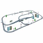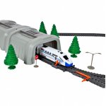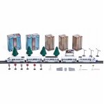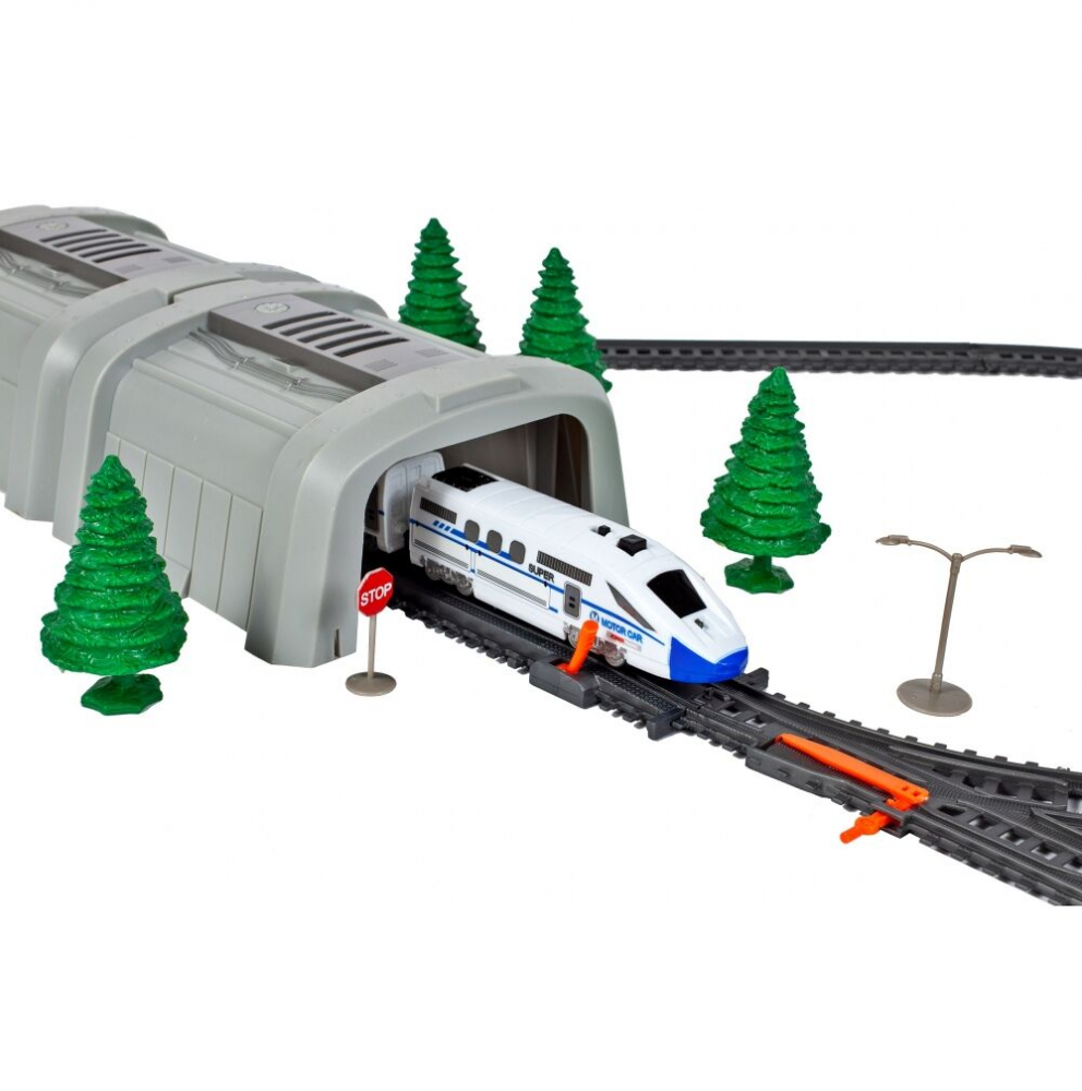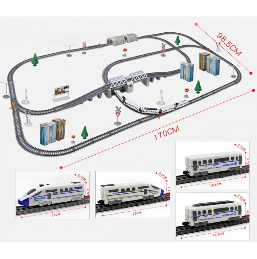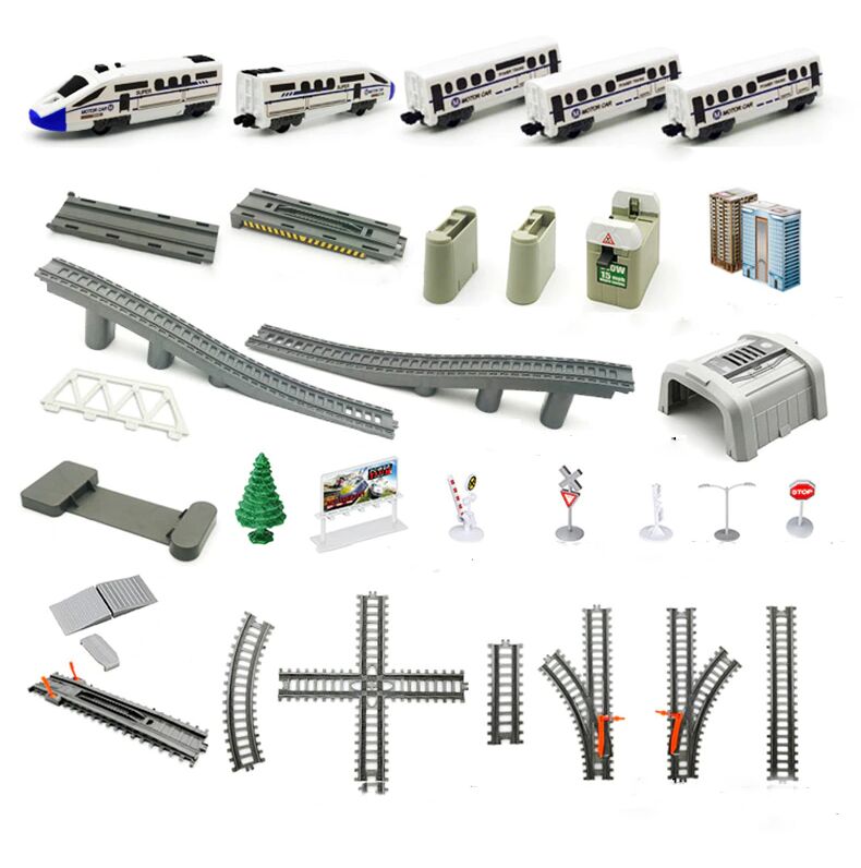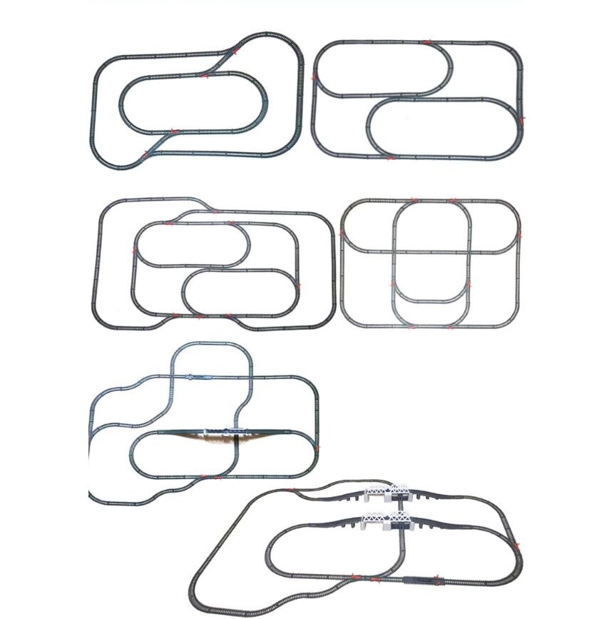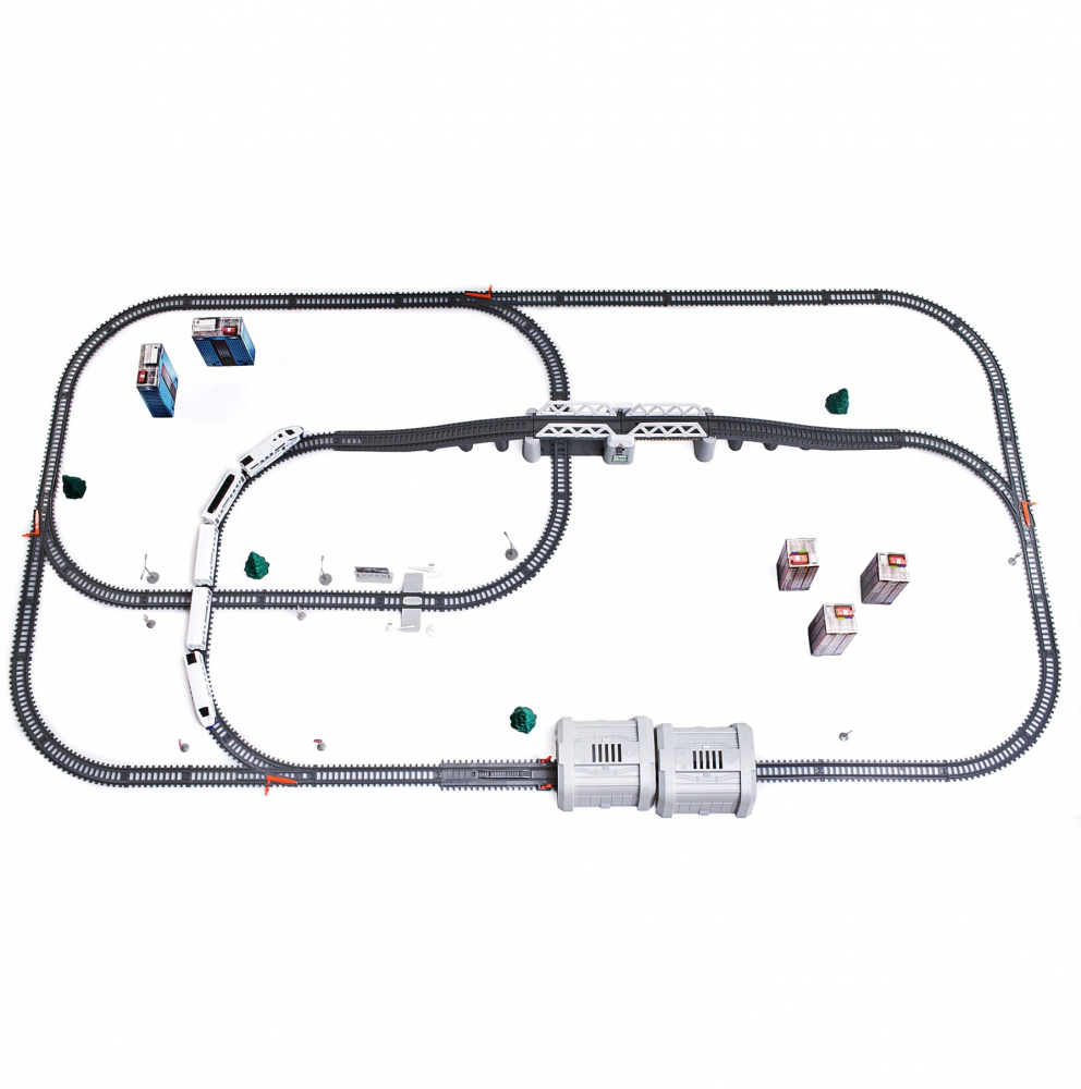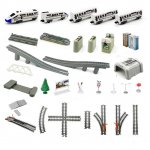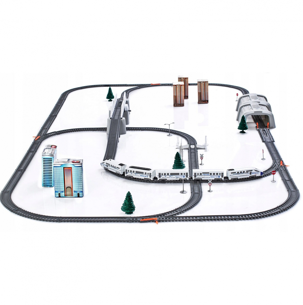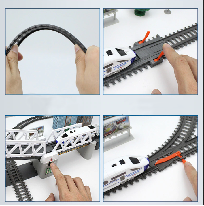 * Multitudinea de elemente oferă oportunități de joc creativ: o pistă de asamblat, o locomotivă + vagoane de pasageri, un pod, tuneluri, indicatoare și copaci.