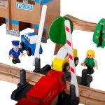 - Setul de tren din lemn contine: 1 tren electric cu 2 vagoane, 1 elicopter, 1 camion de marfa, 1 sectie de politie, sine, pod, oameni, copaci si alte elemente pentru a completa setul de tren.
