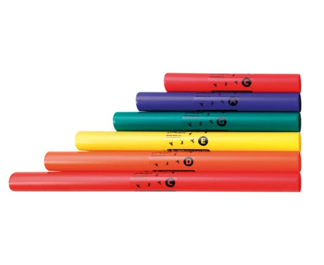 Boomwhackers sunt tuburi de percuție din plastic, fiecare asociat cu o notă muzicală specifică.