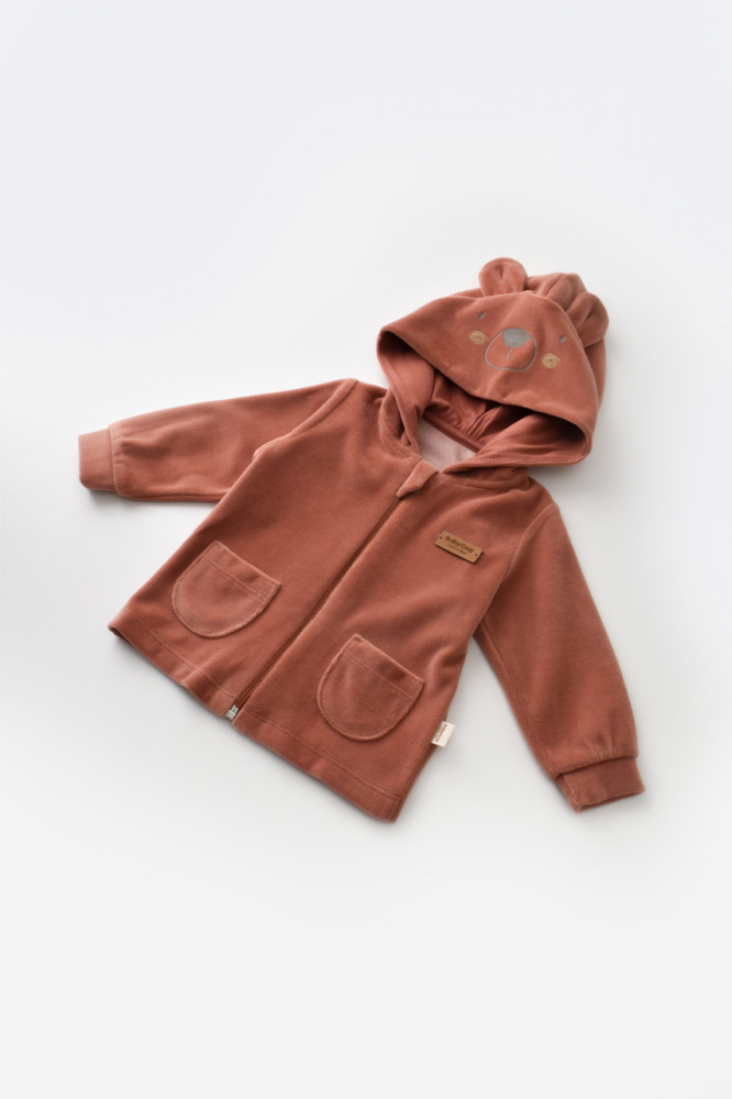 Set Ursulet cu bluzita cu fermoar si gluga si panataloni lungi din Baby Cosy 80% bumbac organic si 20% poliester Caramiziu 12-18 luni