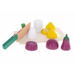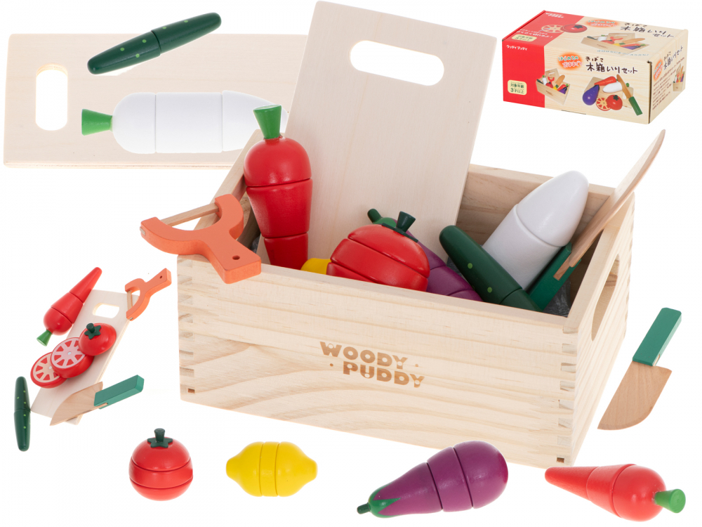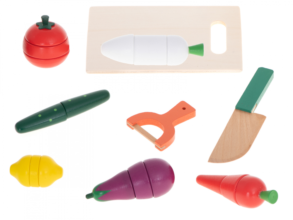 Set Vegetale de feliat pentru copii Ikonka, cu prindere magnetica, tocator si cutit incluse, in Ladita, realizate din Lemn, Woody Puddy