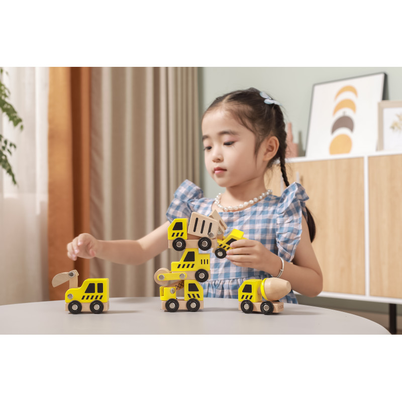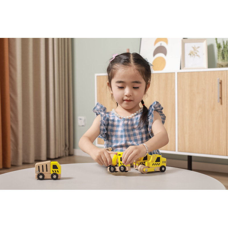 Un set de 6 vehicule folosite in activitatile de constructie, realizate din lemn masiv cu constructie solida.