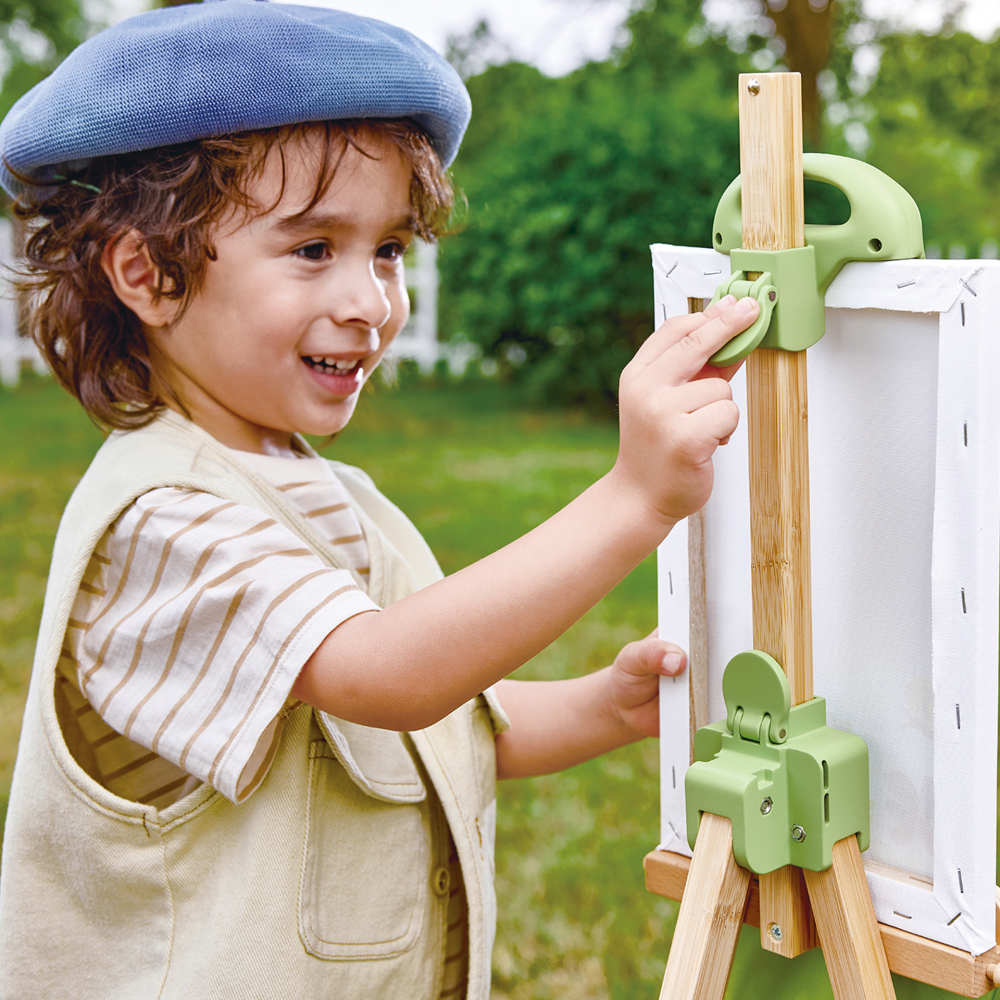 Desi are opt piese din bambus, acest sevalet este usor de asamblat pentru copii. Bambusul usor si accesoriile detasabile il fac usor de transportat in rucsac – ideal pentru arta in aer liber sau in miscare.