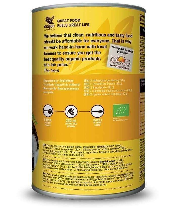 Shake proteic banane si cocos bio 450g Dragon Superfoods - 52% proteine