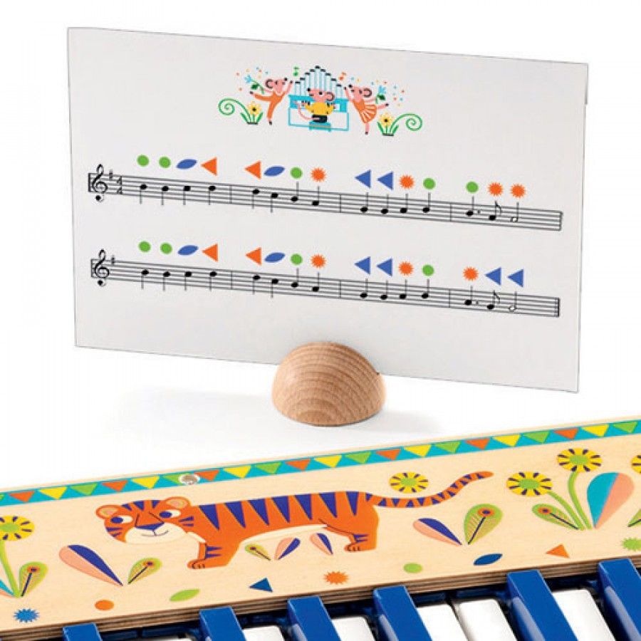 Pe carticica cu partituri inclusa, melodiile sunt redate astfel încât copilul poate identifica nota muzicala dupa simbolul desenat.
