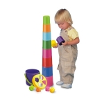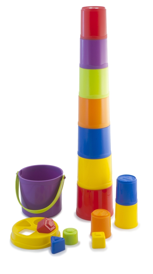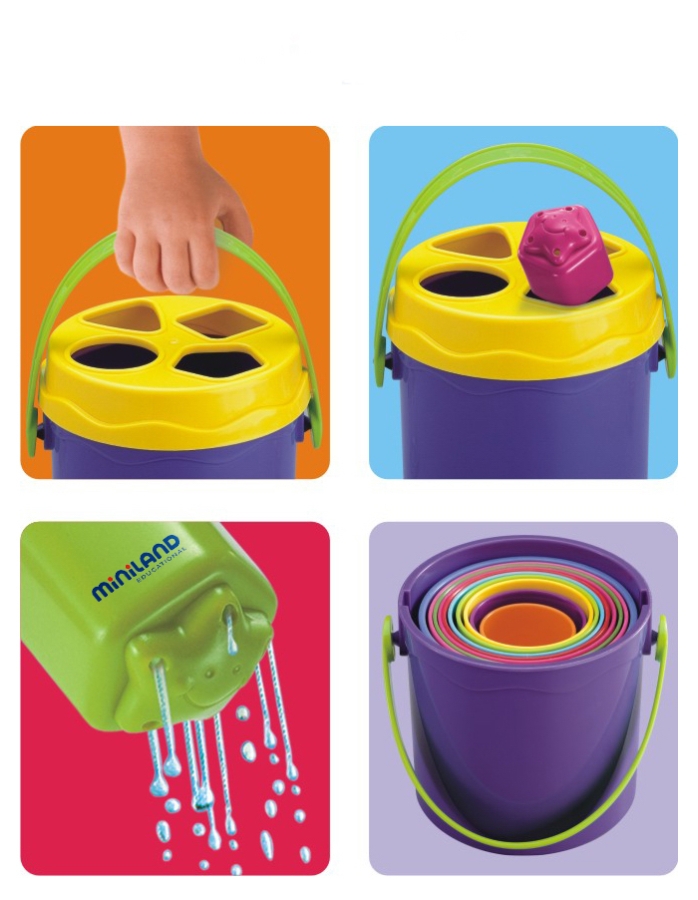 * Setul contine o galetusa cu maner in care "locuiesc" 9 cupe cu dimensiuni progresive,capac cu orificii pentru sortare si patru forme de sortat.