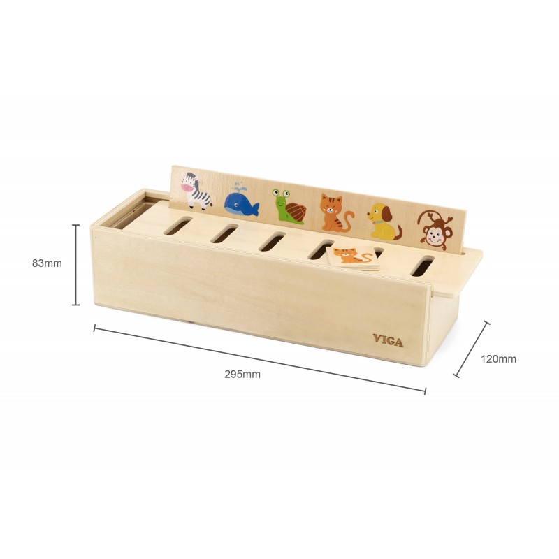 Un sortator al carui capac mobil are 6 fante prin care pot fi introduse cele 48 de piese din lemn cu imagini din urmatoarele categorii: legume, fructe, mijloace de transport, forme, animale si numere.