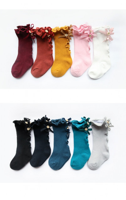 Sosete trei sferturi pentru fetite, cu nasturei si fundite aplicate la spate. Ofera eleganta tinutelor micutelor domnisoare.