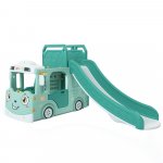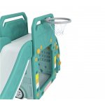 Spatiu de joaca 4 in 1 Nichiduta Happy Bus Green cu saltea impermeabila din spuma, Leagan convertibil, Tobogan cu manere si trepte antiderapante, Cos de baschet,