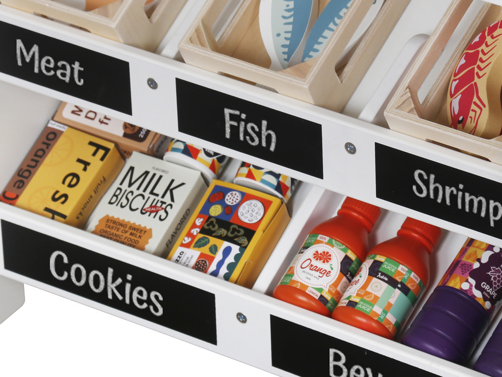 Echipament Bogat pentru Joc de Rol: Setul include o varietate mare de alimente din lemn (fructe, legume, carne, fructe de mare, inghetata, lactate, bauturi), bani de jucarie (monede si bancnote), un clopotel, un smartphone si un card de plata (manechin), o geanta de cumparaturi din hartie si cosuri din lemn.