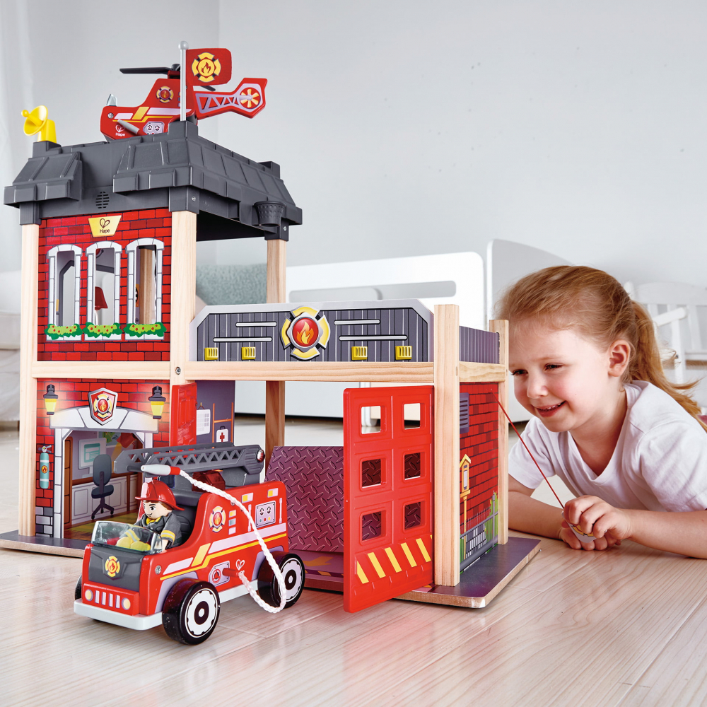 Tot ce va avea nevoie pompierul tau pentru a salva vieti este gata, un topor, elicopter, hidrant de incendiu, steag si panou de control!