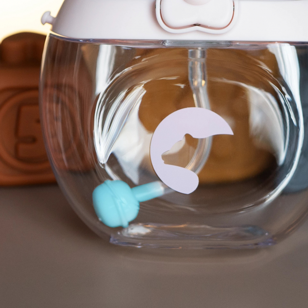 Un element distinctiv este mingea gravitationala integrata in pai, care permite copilului sa se hidrateze eficient din orice pozitie, asigurand un flux continuu de lichid indiferent de inclinarea sticlei.