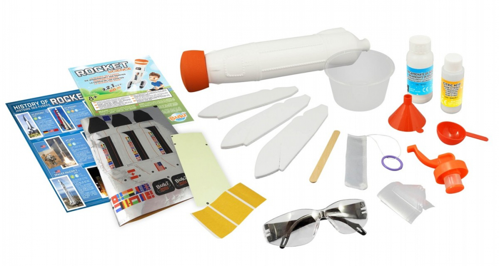 Setul contine: 1 racheta, dop de siguranta, filtru, 3 aripioare din spuma, 3 suporturi pentru aripioare, benzi adezive fata-verso, acid citric, bicarbonat de sodiu, lingura de masurare, agitator, palnie, bol, autocolante, poster, ochelari de protectie.