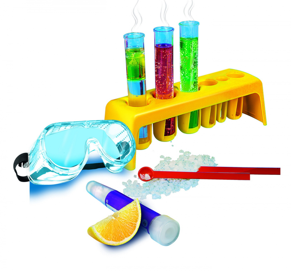 Setul contine ochelari de protectie, pahare gradate, eprubete de plastic, perie de curatat eprubetele, agitator, pipeta, cheie de siguranta pentru eprubete, spatula, stativ, palnie, hartie de filtru, penseta, substante chimice si manual de sintructiuni pentru a putea realiza pas cu pas si in siguranta deplina peste 100 de experimente chimice.