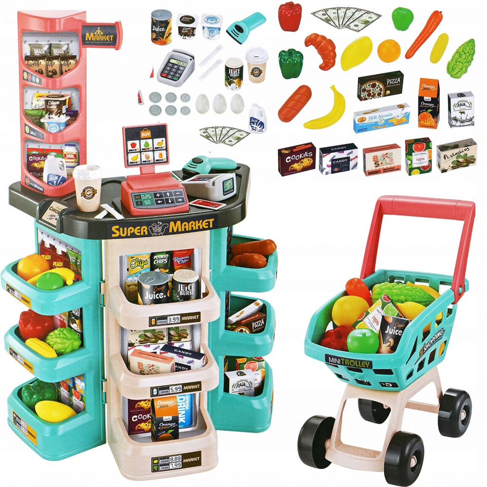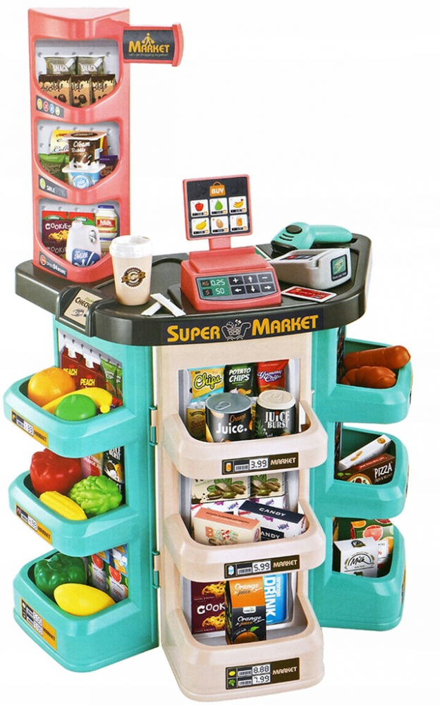 Supermarket cu casa de marcat si carucior de cumparaturi Matadi Home supermarket Turcoaz cu 47 accesorii incluse,scaner cu lumina,cititor de carduri si alimente