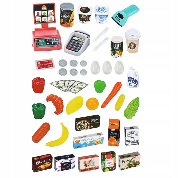 - Setul include si un cos de cumparaturi practic, astfel incat copiii sa se poata juca impreuna la magazin si sa schimbe rolurile intre vanzator si cumparator.