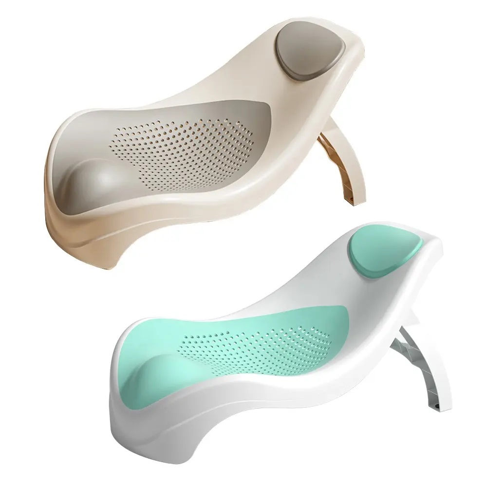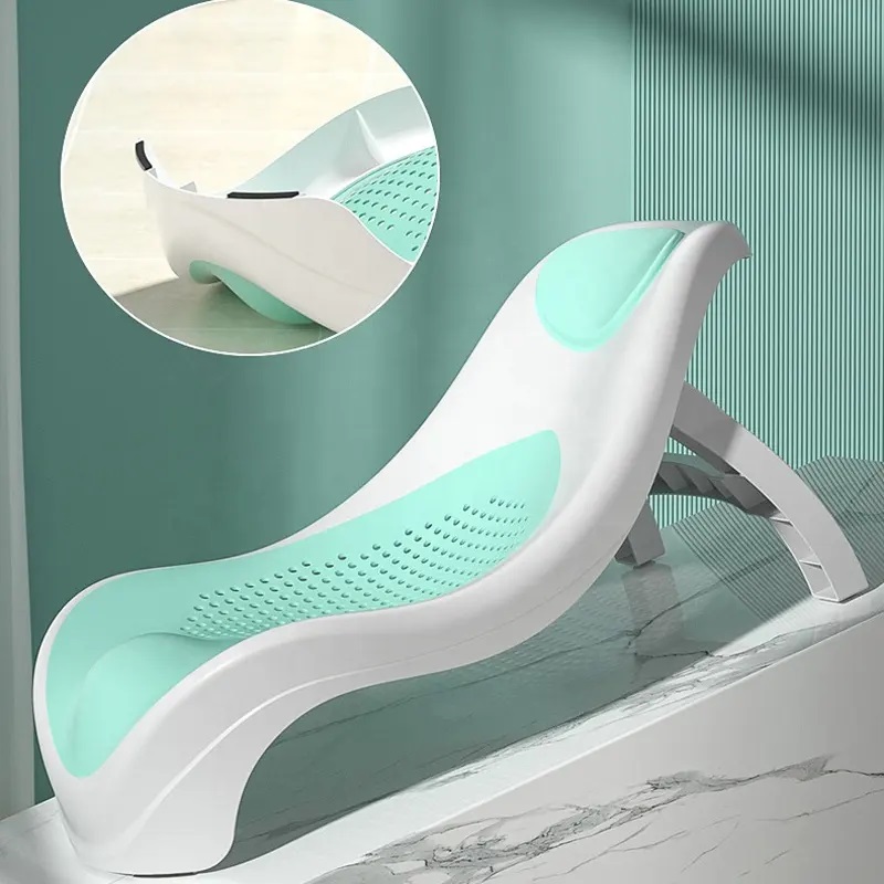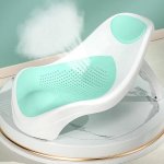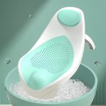 Suport de baie pentru bebelusi Little Mom Green design ergonomic pliabil, prevazut cu tetiera si suprafata texturata cu gauri de scurgere a apei, dimensiune 54 x 27.5 x 22 cm