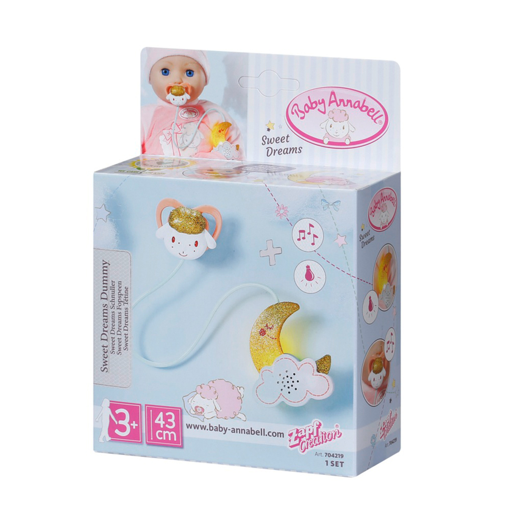De indata ce are Baby Annabell - Suzeta cu lumina si cantece 43 cm de la Zapf Creation in gura, canta un cantec de leagan si oita canta melodia „Baa”. Luna adorabila lumineaza drumul catre tara viselor.