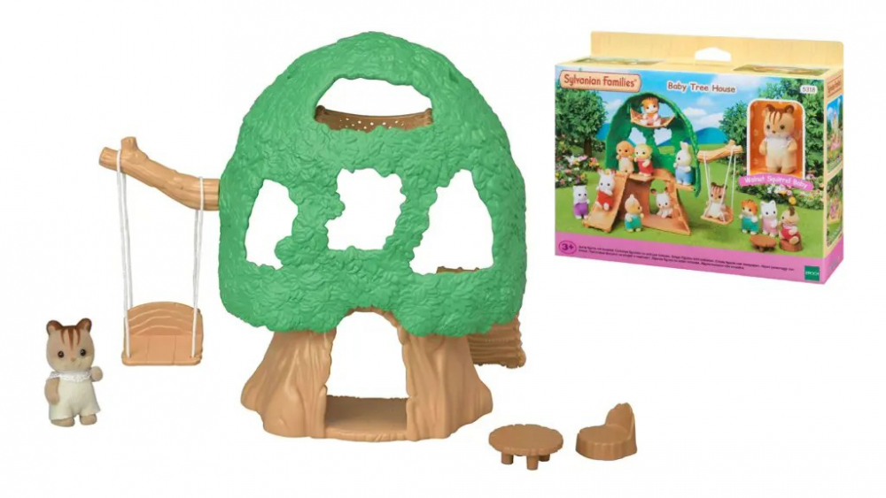 Setul incluse: 1 casuta Baby Tree House cu leagan, hamac si tobogan; 1 figurina Walnut Squirrel Baby; 1 set masuta +1 scaun.