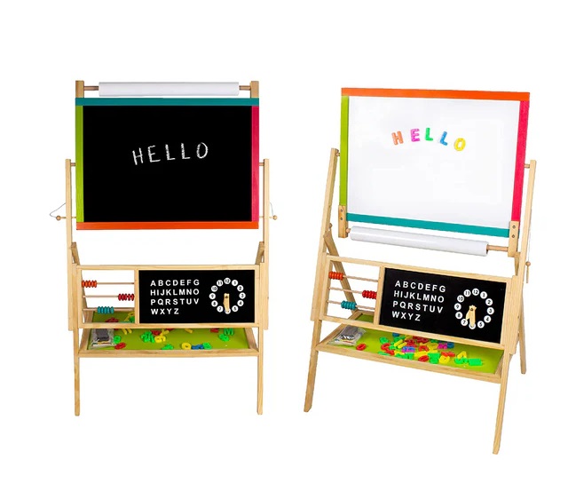 Aceasta tabla educativa pentru desen, scris si numarat pentru copii va oferi copilului dumneavoastra o multime de activitati distractive. Partea neagra este potrivita pentru scris cu creta, iar partea alba a sevaletului creativ 3 in 1 ii permite copilului sa fie creativ cu markere si litere magnetice.