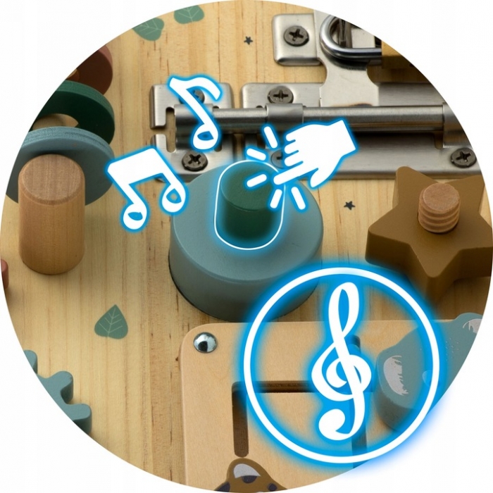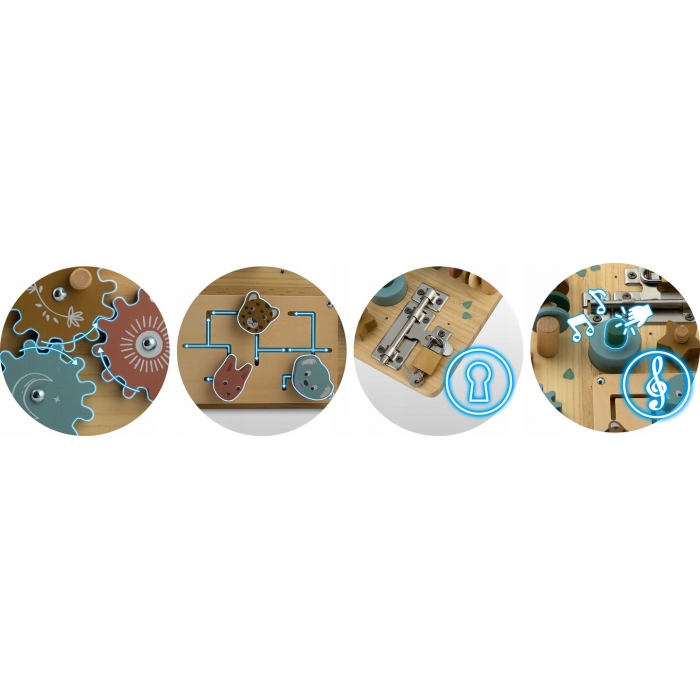 - Dezvoltarea abilitatilor motorii: echipata cu o varietate de activitati, cum ar fi incuietori, roti dintate si butoane, placa sprijina dezvoltarea abilitatilor motorii fine.