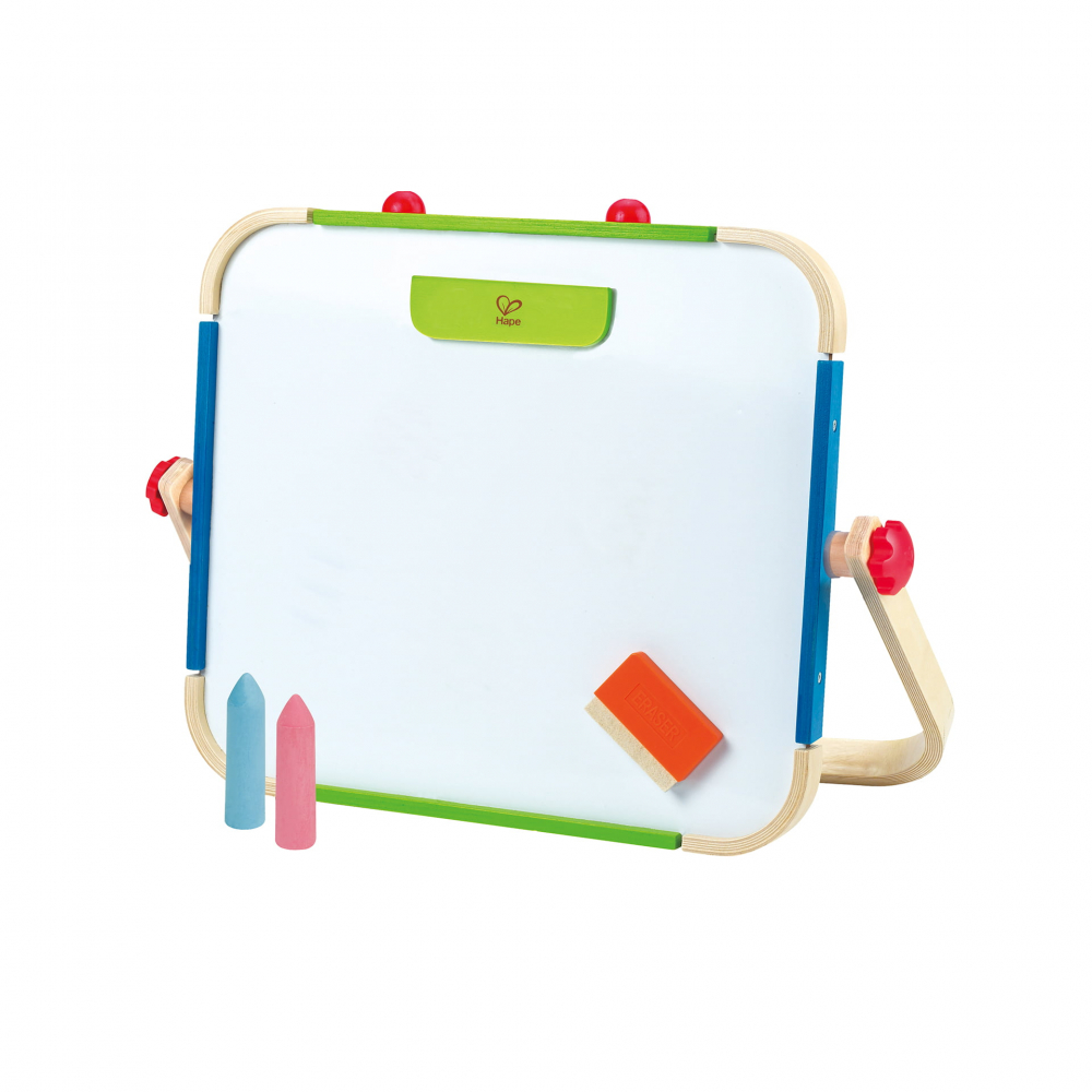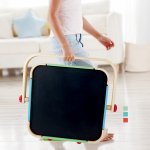 Acest sevalet din lemn este convenabil fata-verso, cu o tabla magnetica pe o parte pentru scris si tabla de sters pe cealalta parte pentru a desena imagini si a colora.