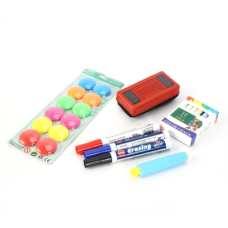 Pachetul contine: tabla, suport pentru accesorii, set de magneti, markere, creta, burete.