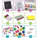Setul include toate lucrurile necesare pentru a invata si a se juca: 2 parti (una magnetica, iar cealalta pentru creta) rotative, din materiale sigure pentru copii, foarte stabile.