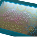 Tableta de desen cu iluminare LED ii ajuta sa redea siluetele animalelor de pe cele 12 foi ilustrate, folosind stiloul special inclus. Pe verso, tableta se transforma intr-o tabla neagra cu lumina neon, perfecta pentru desen liber cu markerele colorate din set.