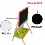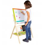 Combinarea desenului cu scrierea, crearea si invatarea dezvolta creativitatea si imaginatia copilului dumnevoastra. Prin urmare tablita de scris pentru copii este realizata din lemn de inalta calitate, usor de pliat. Aceasta este prevazuta cu un raft pentru depozitarea accesoriilor. Include un set de alfabet pentru a invata literele intr-un mode creativ si distractiv dar si un ceas pentru a invatarea orelor. Suprafetele sunt rezistente la apa si usor de curatat.