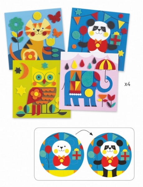 Jocul conține: 4 planșe, elemente autoadezive din fetru, o cărticică cu instrucțiuni pas cu pas, în imagini.