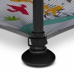 Partea superioara a parcului de joaca, care contine imbinarile elementelor metalice care permit plierea si desfasurarea acestuia, a fost asigurata cu un panou larg din material estetic, care intareste stabilitatea structurii si previne posibilele raniri in timpul jocului.