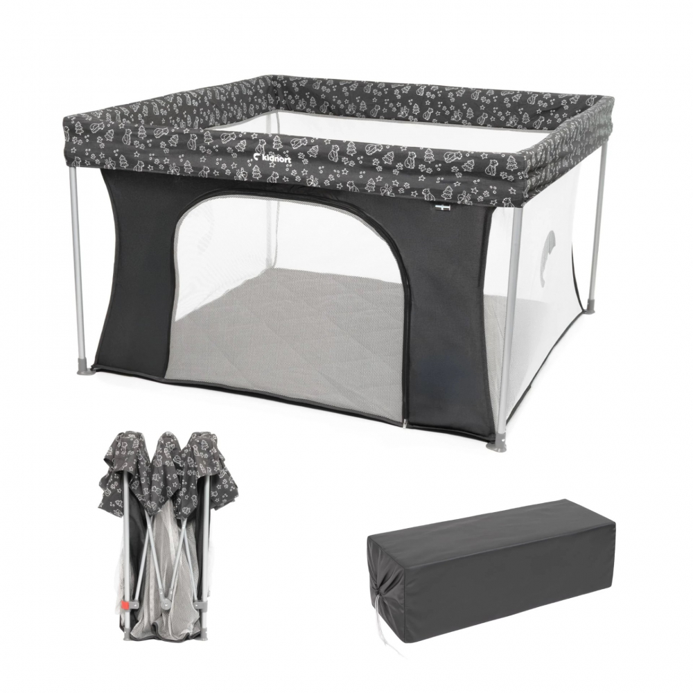 Tarc de joaca pentru copii Kidnort Snoen Dark Grey, pliabil, design modern si sigur, acces mare cu fermoar actionat din exterior, husa depozitare inclusa, dimensiune 126.5 x 74.5 cm