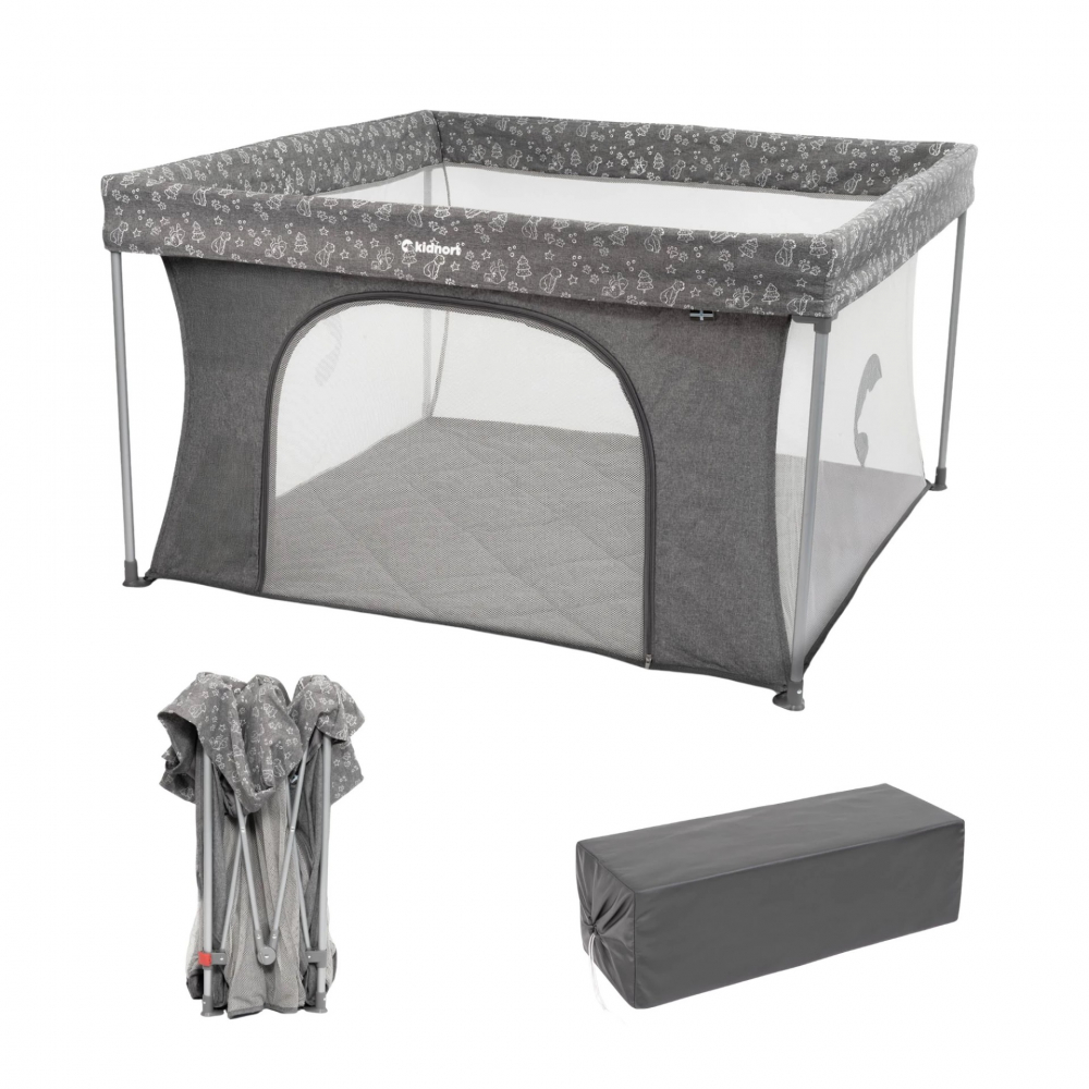 Tarc de joaca pentru copii Kidnort Snoen Light Grey, pliabil, design modern si sigur, acces mare cu fermoar actionat din exterior, husa depozitare inclusa, dimensiune 126.5 x 74.5 cm