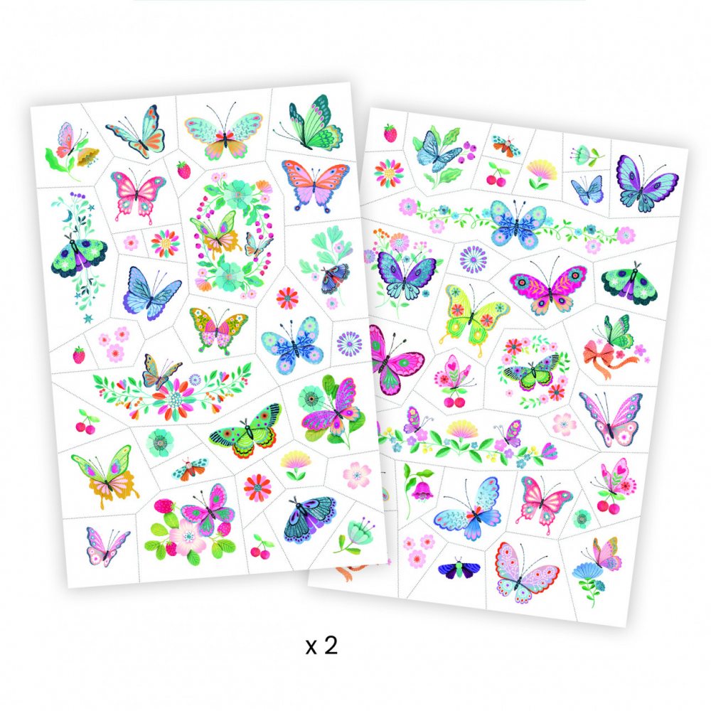 Două foi de tatuaje temporare cu culori blânde, pastelate și sclipitoare, pentru fluturi de poveste!