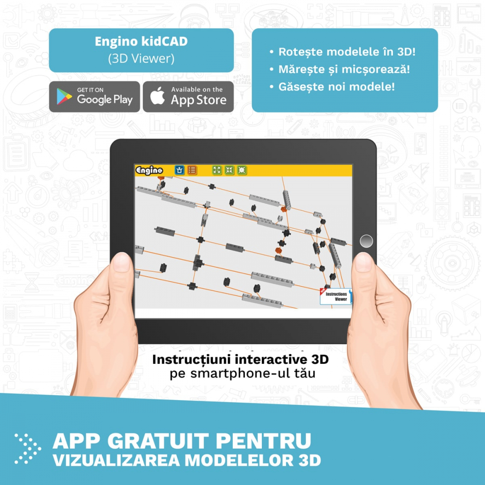- Aplicație gratuită: este disponibilă și o aplicație gratuită – ENGINO kidCAD (3D Viewer) unde copiii pot descoperi mai multe modele 3D cu instrucțiuni și sfaturi privind asamblarea.
