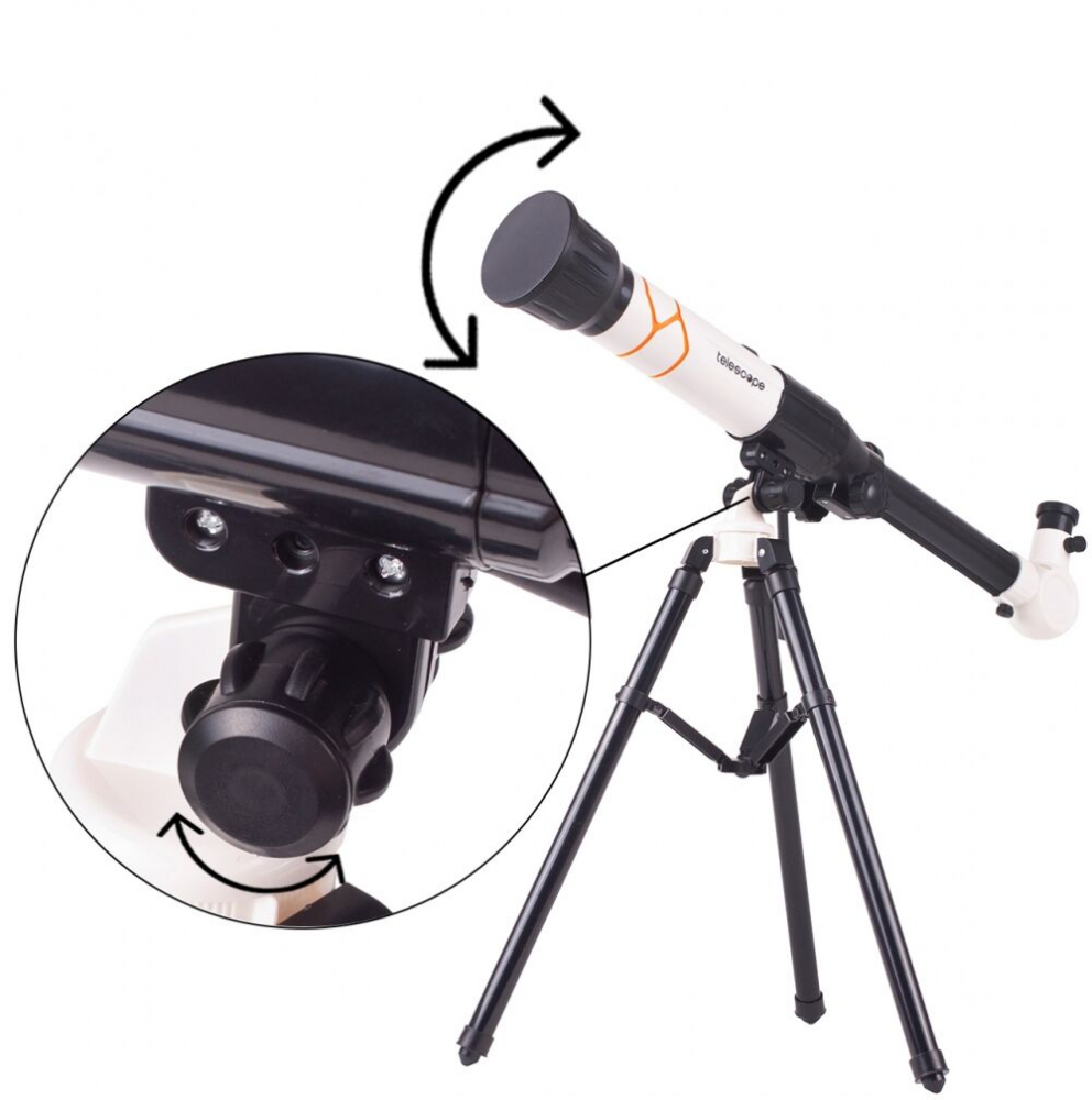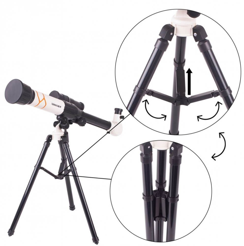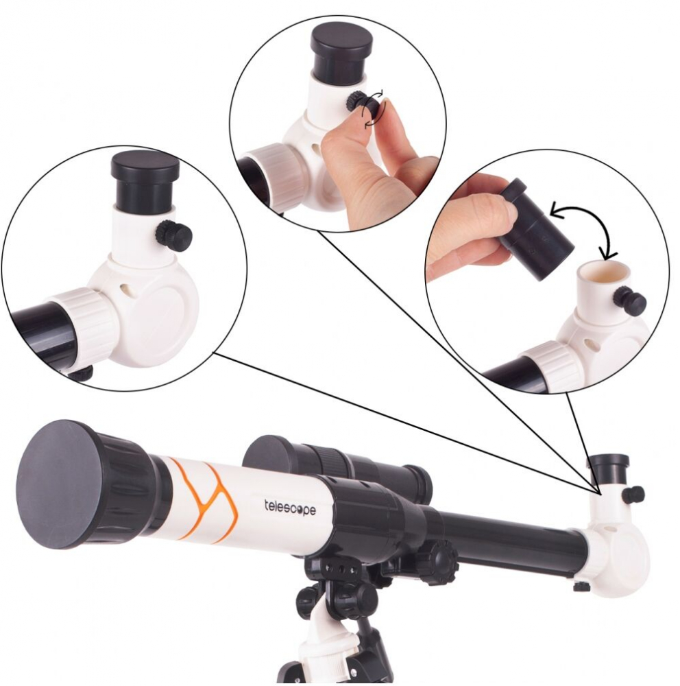 * Setul de telescop include trei oculare cu diferite grade de marire. Instrumentul ofera o marire de pana la 40x. Setul include, de asemenea, un ocular de ridicare care va permite sa obtineti o imagine directa, dreapta.