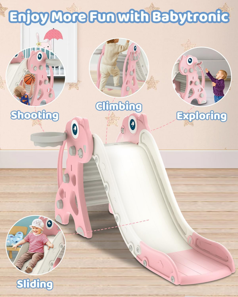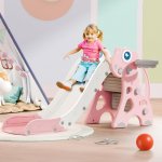 * Toboganul este echipat si cu un cos de baschet, si un joc de precizie cu inele, astfel incat copilasii se pot distra pe cinste aruncand la cos in timp ce se joaca.