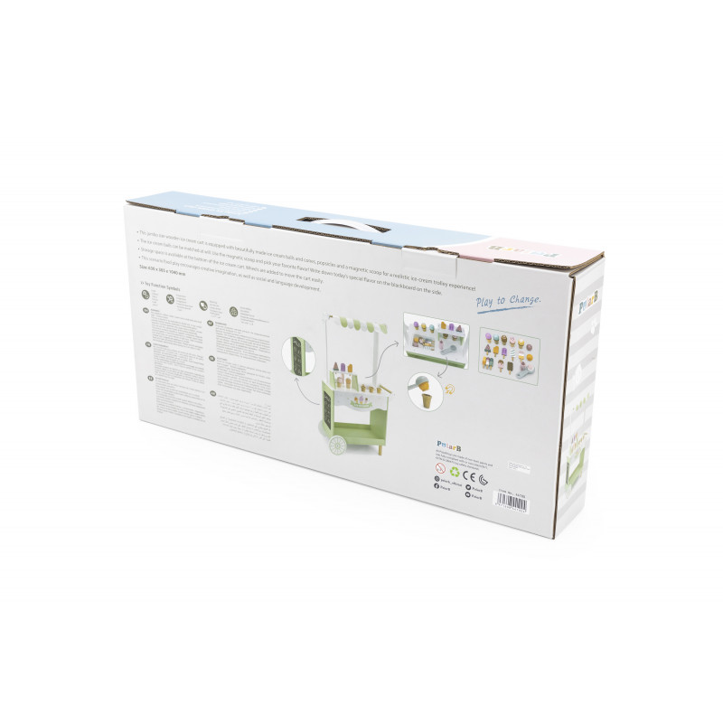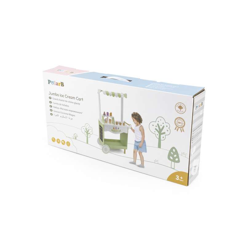 Aceasta toneta de inghetata pe roti, de dimensiune jumbo, este echipata cu bile si conuri de inghetata, popsicle si o lingurita magnetica pentru o experienta realista cu caruciorul cu inghetata!