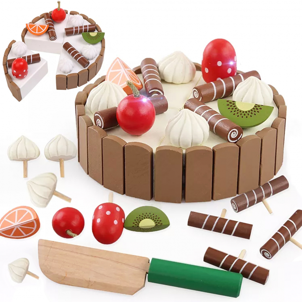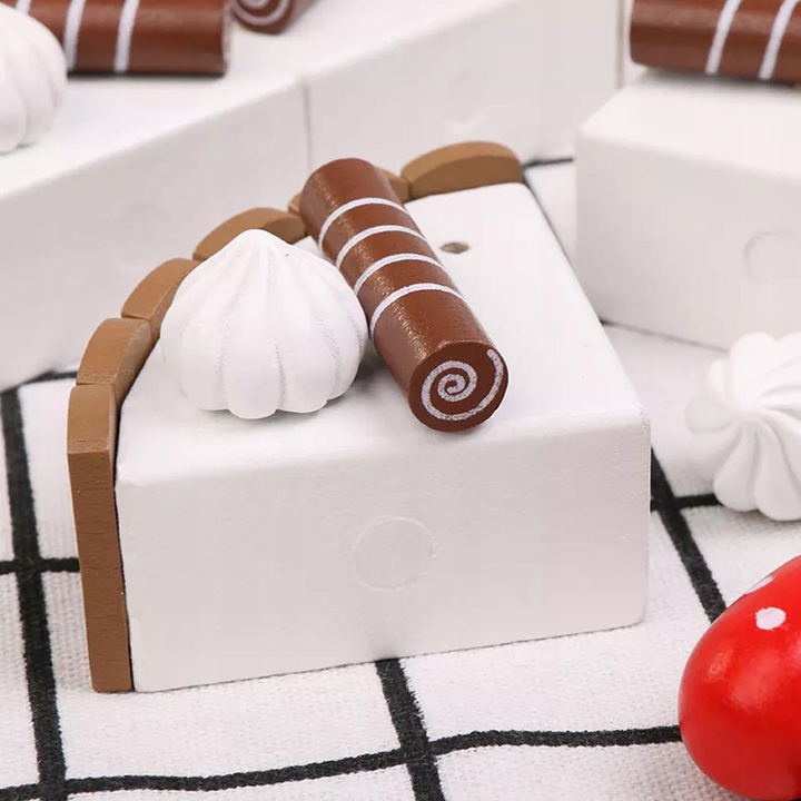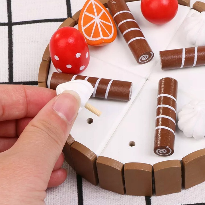 Tort aniversar din lemn pentru copii cu decoratiuni Un tort de jucarie pentru ziua ta de nastere. Setul este format din 17 elemente. Prezinta-i copilului tau o prajitura pe care sa o poata folosi si pentru distractie. Bucati de tort conectate cu un magnet.